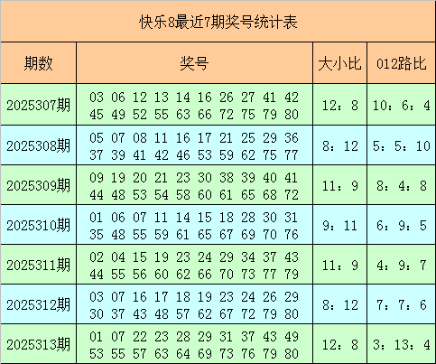 惬心8第2025313期奖号为:01 07 22 23 28 29 31 37 43 49 53 55 57 63 64 69 73 76 79 80,其中奖号012路比为3:13:4,大小比为12:8。